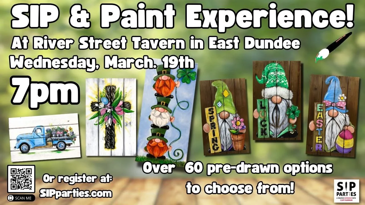 Paint & Sip Night Wednesday, March 19, 2025 7:00 PM 10:00 PM 19:00 22:00 River Street Tavern 102 North River Street East Dundee, IL, 60118 United States (map) Google Calendar ICS